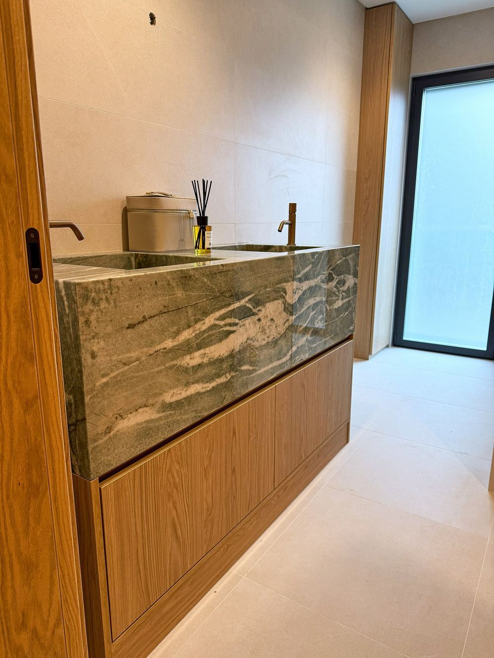 Designed to support a statement stone sink, the piece balances natural materials with refined detailing, creating a contemporary and elegant bathroom solution.