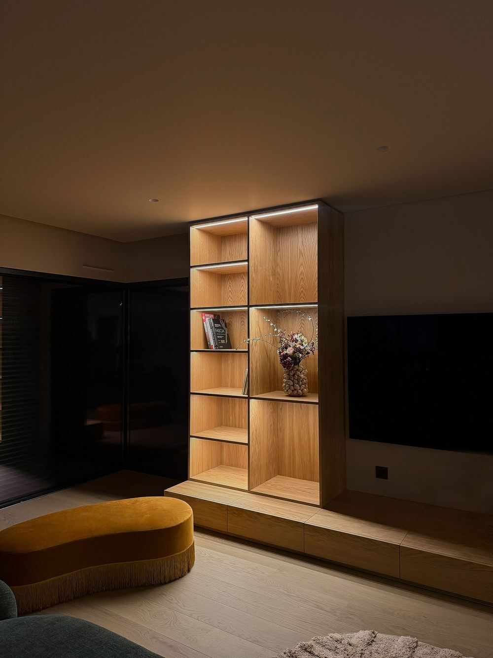 This custom-built shelving unit is crafted from MDF, finished with natural oak veneer and protected with a clear lacquer coating.